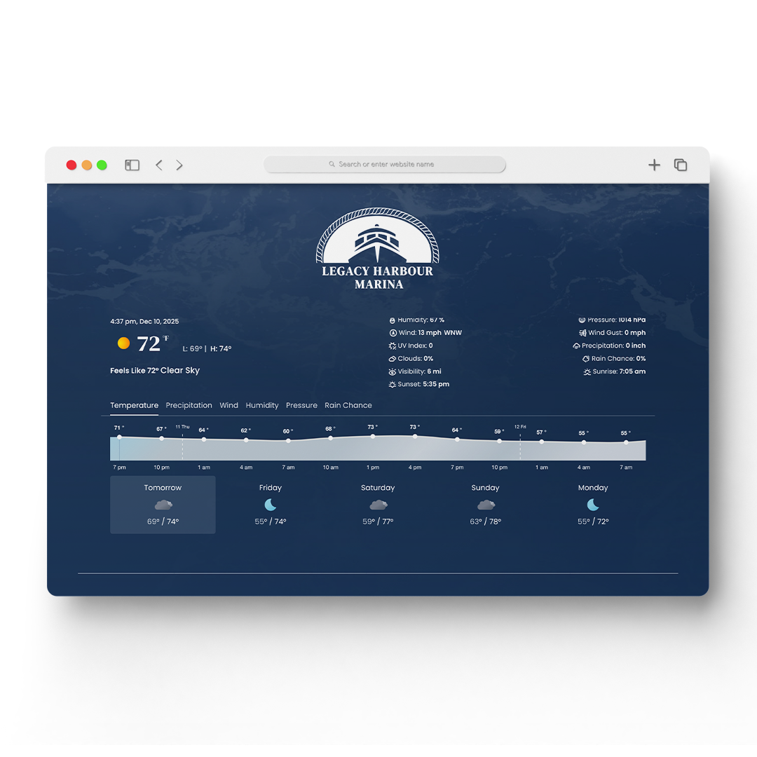 As the marina progresses toward its reopening, the website is designed to scale with new amenities, updated photography, and added features. It provides the strong digital foundation Legacy Harbour Marina needed to reintroduce itself to both local and visiting boaters.