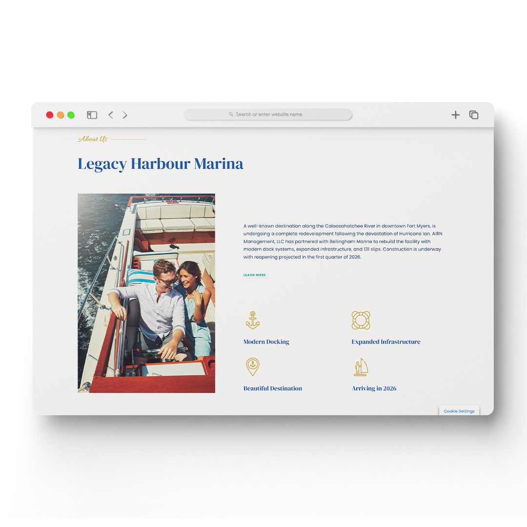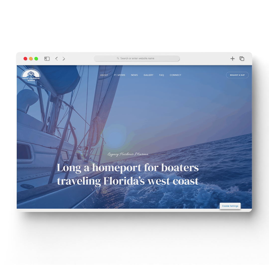 Legacy Harbour Marina is a well-known boating destination along the Caloosahatchee River in downtown Fort Myers. After Hurricane Ian, the marina entered a major redevelopment phase. Although a website for a separate on-property project had launched previously, that project did not move forward, and the marina no longer had an active, accurate digital home. With a refreshed brand led by Duree & Co, the team needed a clean, modern website that clearly communicated its amenities, slip reservation process, and redevelopment plans.